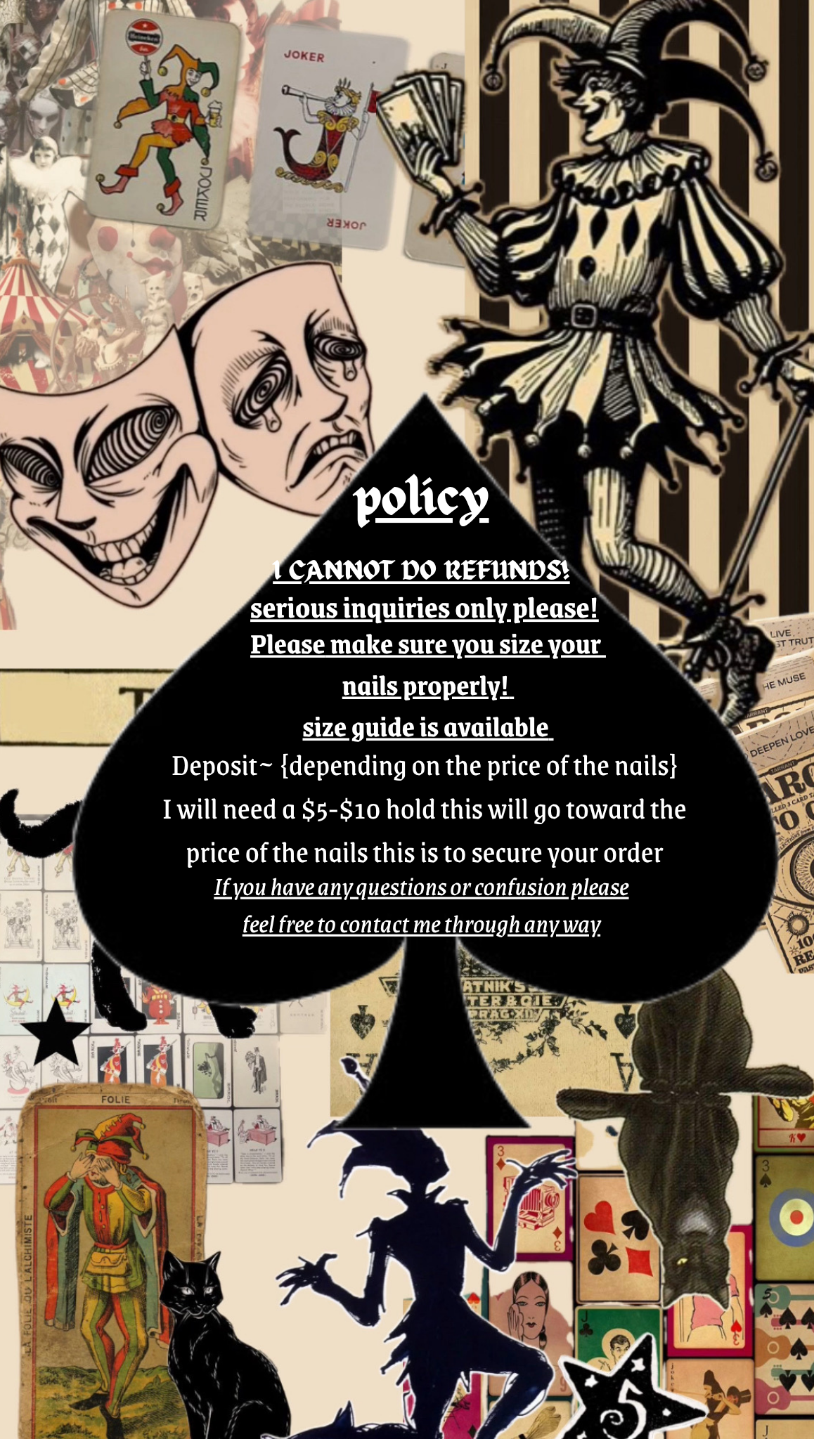 policy~ if you sized you nails wrong, I CANNOT DO REFUNDS! however, if the mistake is on me I will compensate*